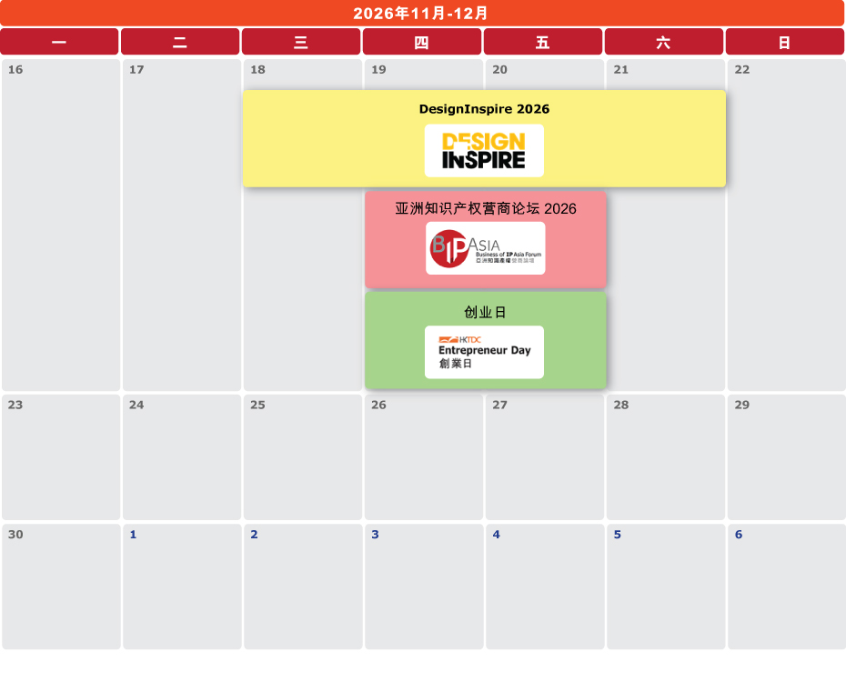 | DesignInspire 2026 • 2026年11月18日(贵宾预展) • 2026年11月19-20日 (四至六) • 香港会议展览中心 主办机构 : 香港贸发局 |